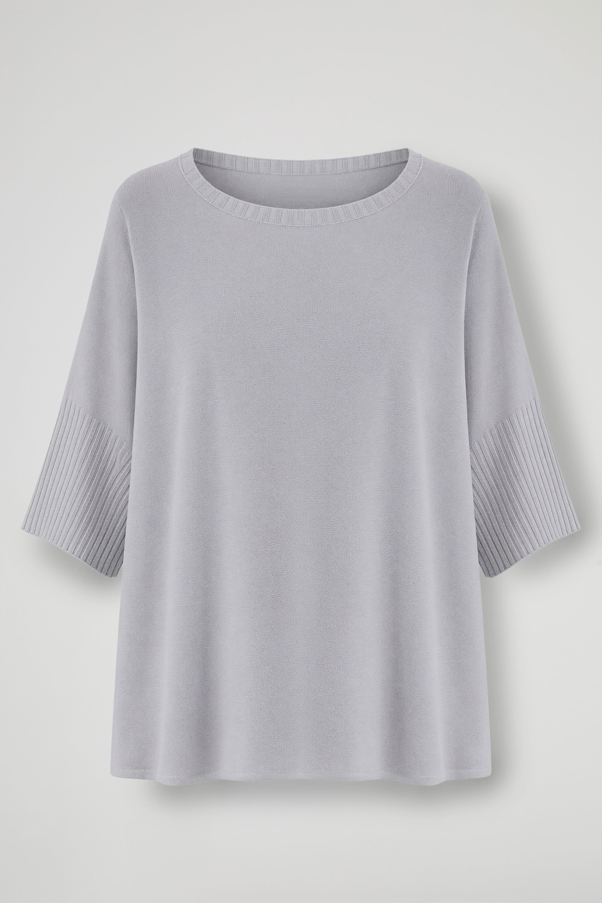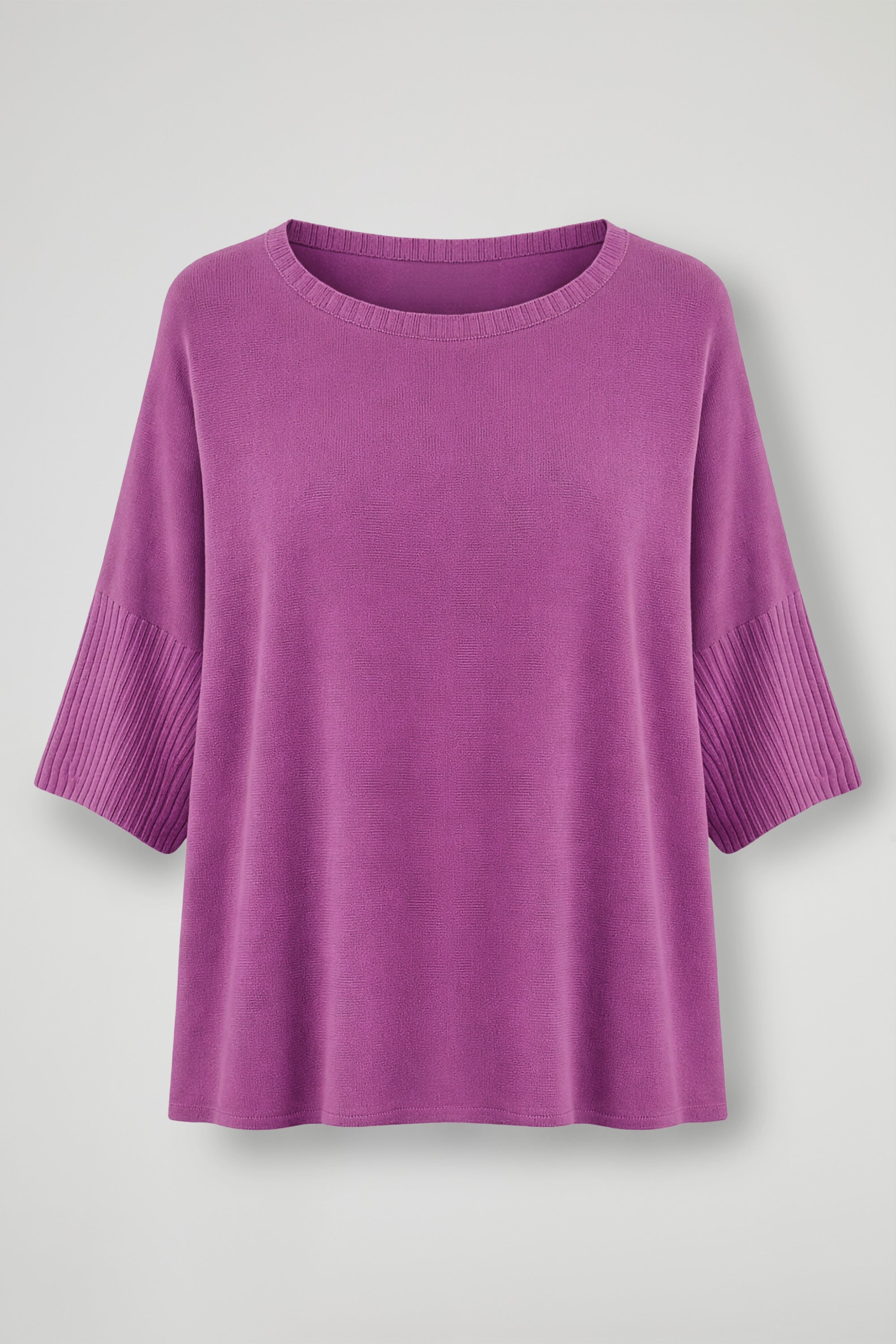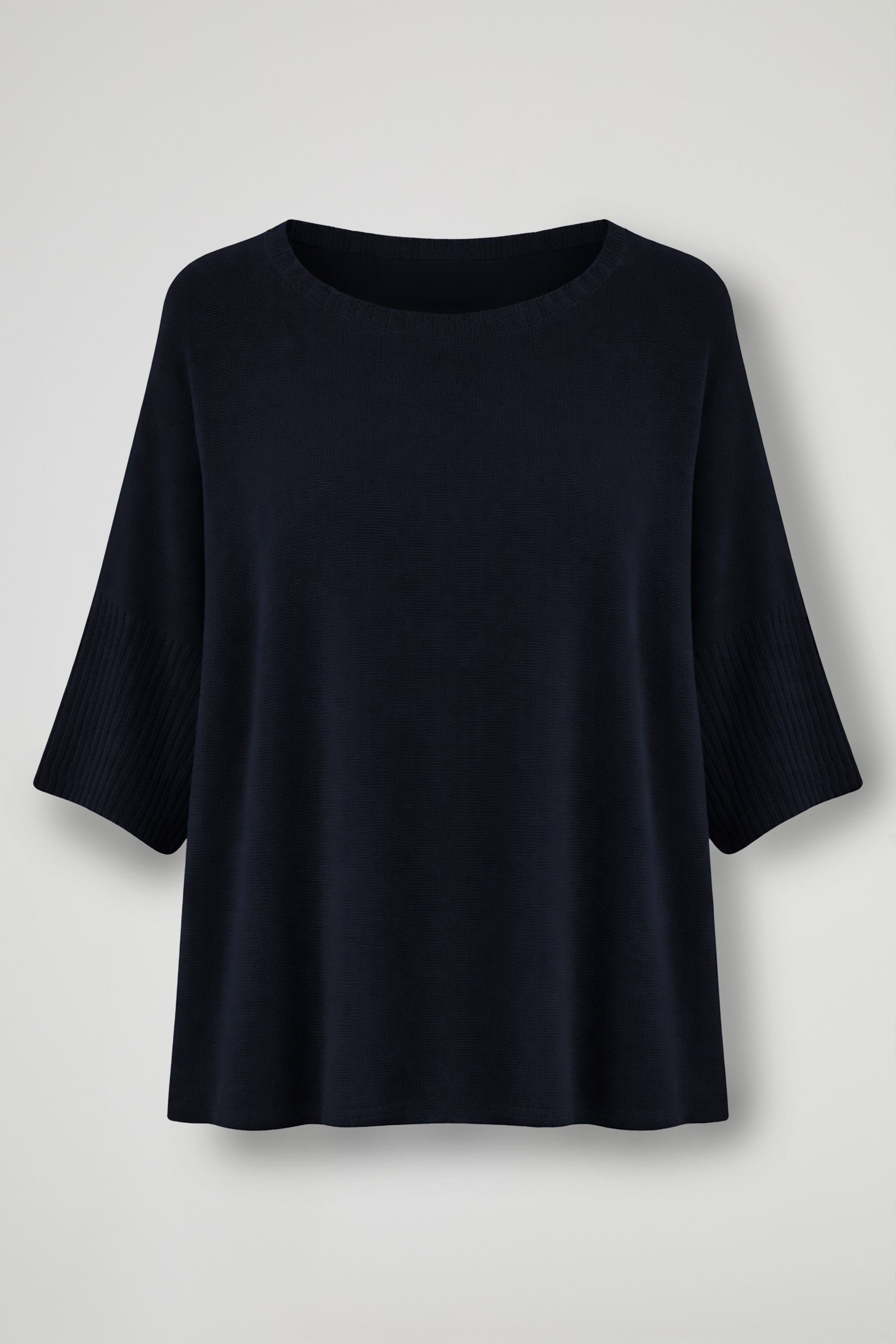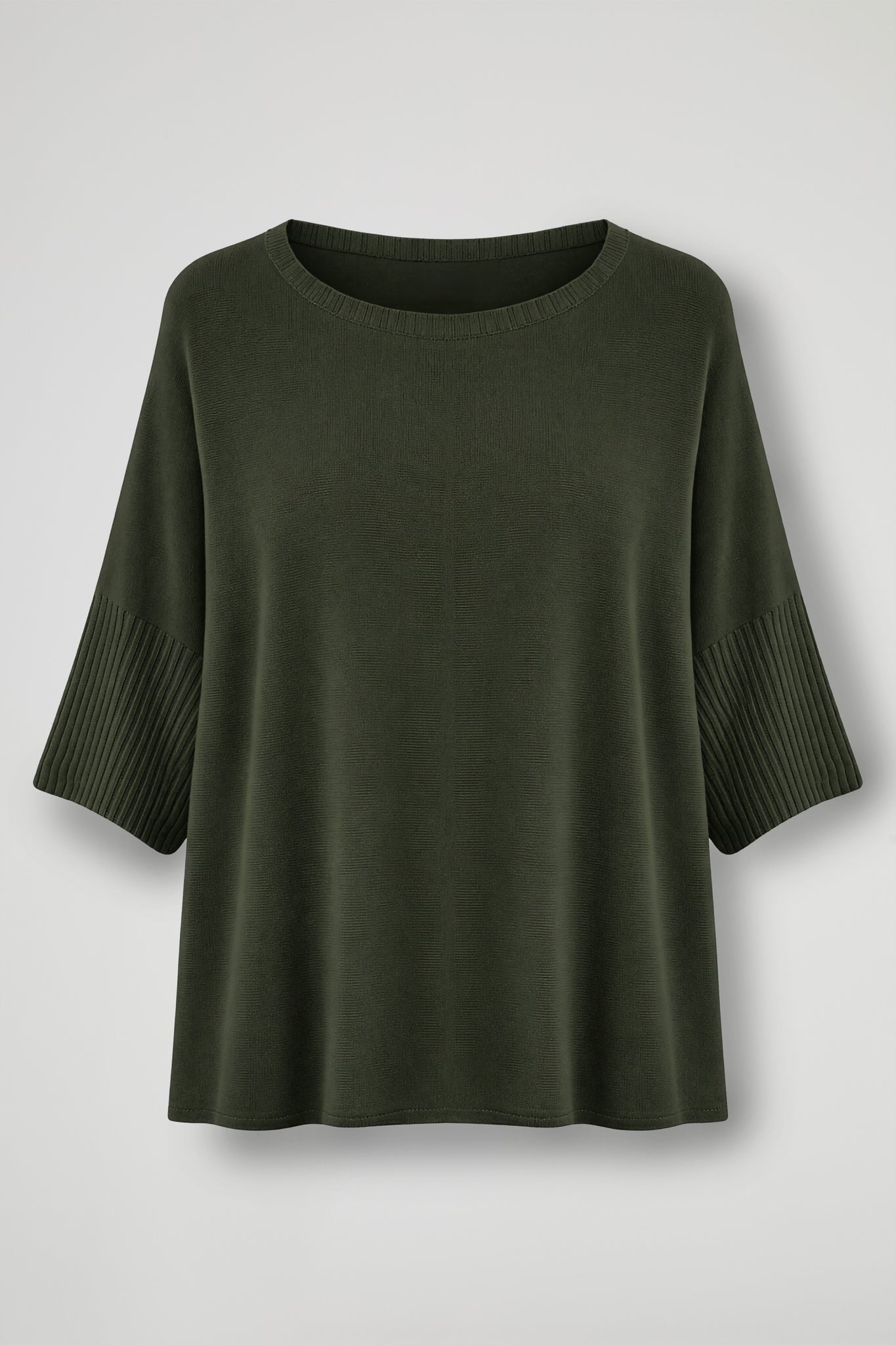 Maglia over in morbida maglina di viscosa, scollo ampio con bordo a taglio vivo, manica corta a pipistrello con dettaglio costine sul fondo. Fondo con bordo a taglio vivo. Linea ampia .