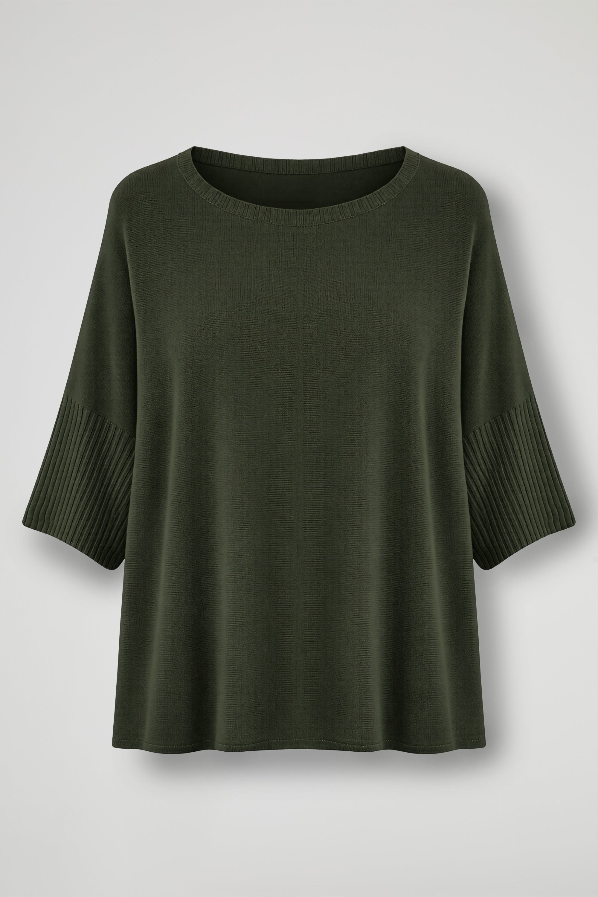 Maglia over in maglina di viscosa , il design morbido e scivolato accarezza le forme senza segnare , mentre lo scollo ampio a taglio vivo valorizza collo e spalle . Le maniche morbide a pipistrello aggiungono comfort e movimento , rendendola ideale dalla primavera all'estate, ma anche sotto blazer e trench nelle mezze stagioni.