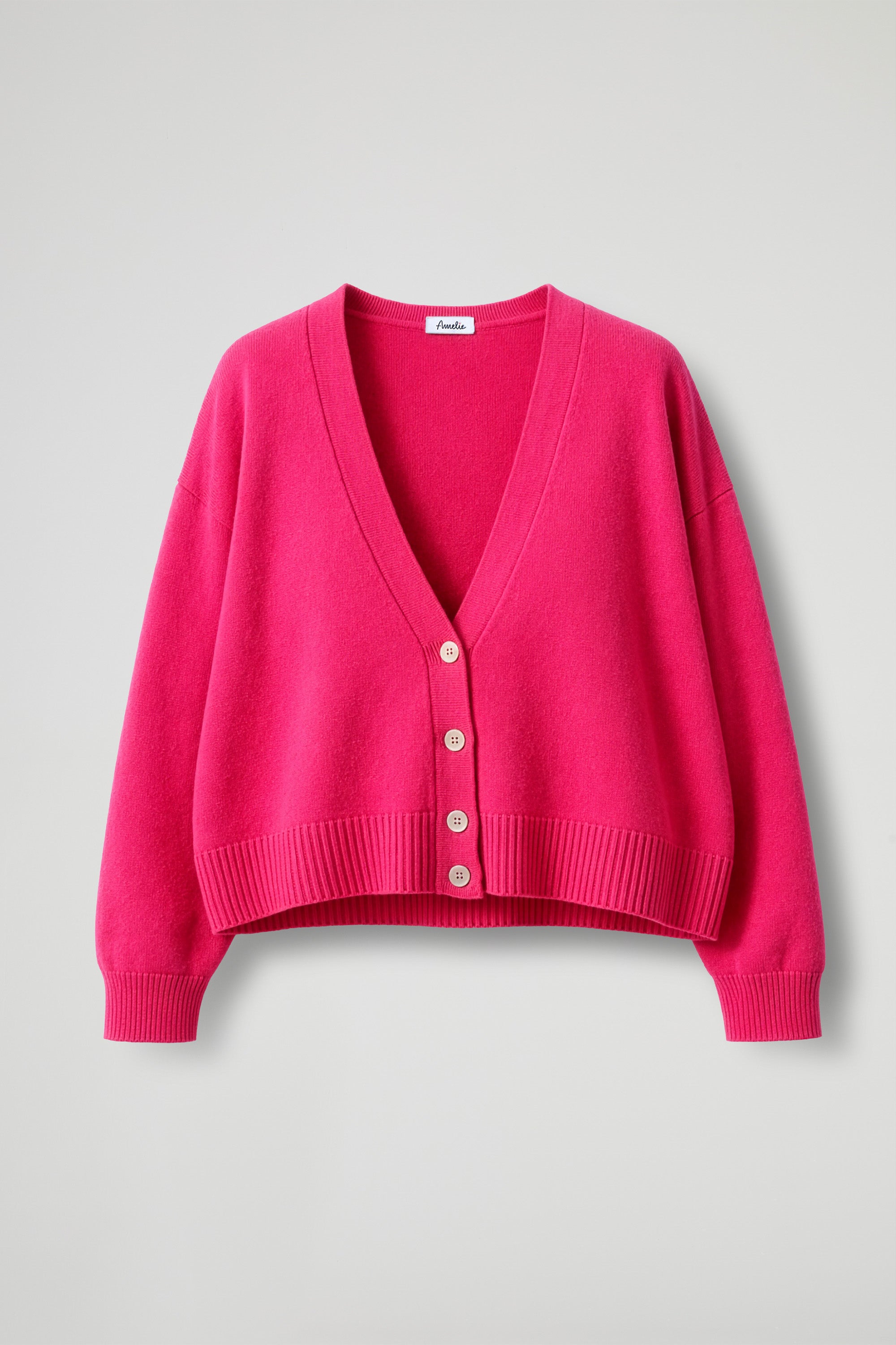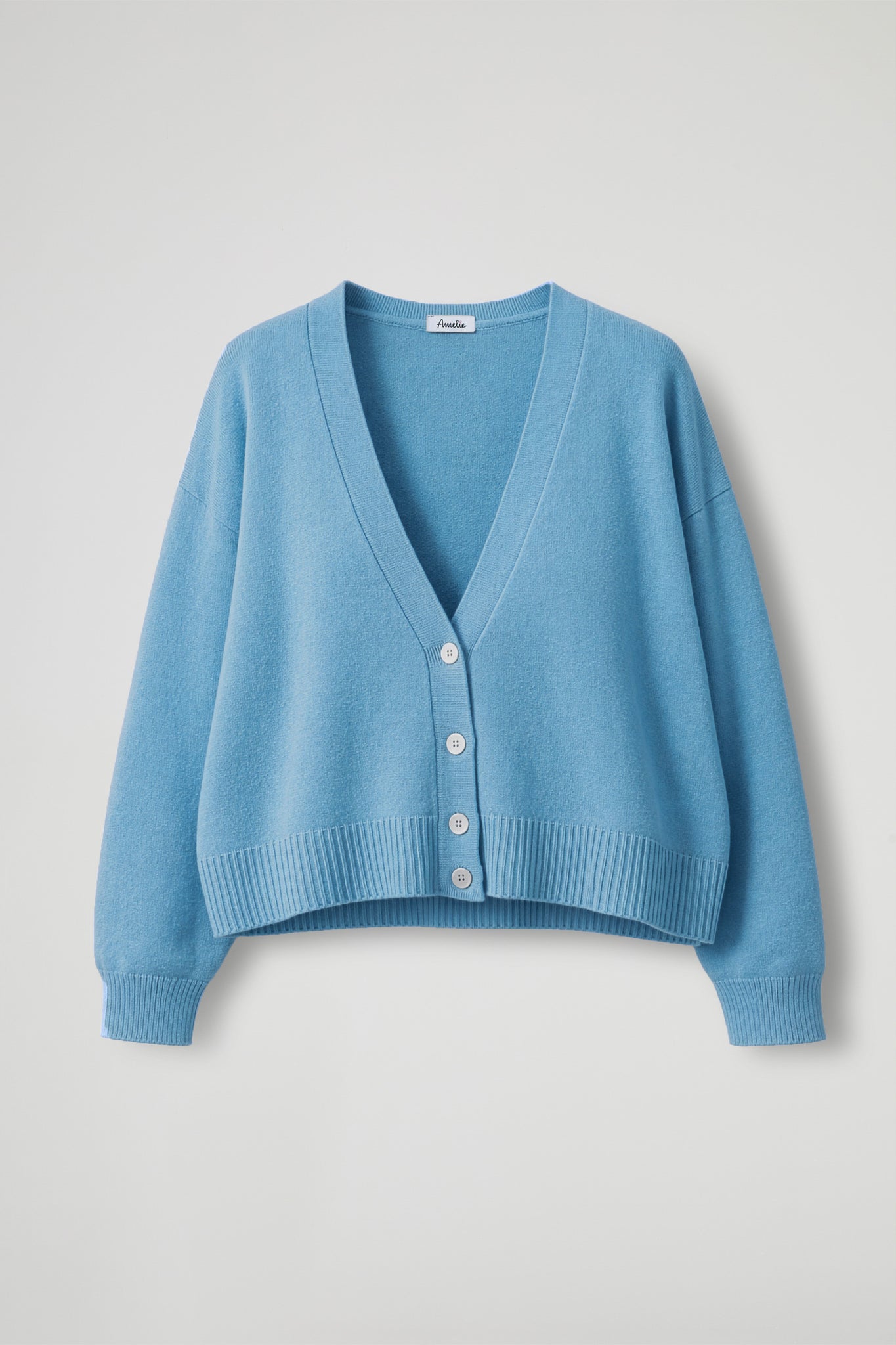 Cardigan dallo scollo a V profondo, spalle scese con manica leggermente a balloon, dettaglio costine sul fondo, chiusura frontale con bottoni madreperlati, orlo asimmetrico più corto davanti con dettaglio a coste. Linea morbida