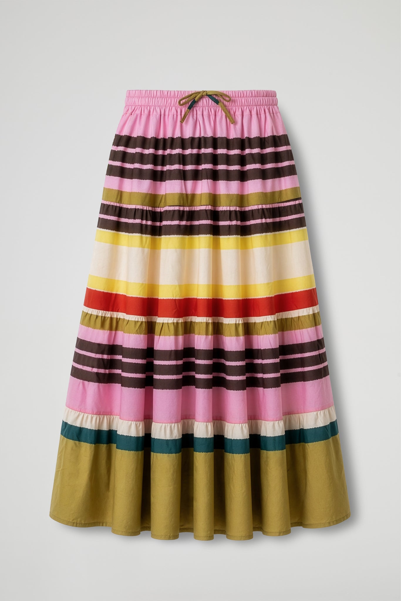 Gonna lunga in cotone, elastico con coulisse regolabile in vita, tasche all'americana, stampa a righe orizzontali multicolor su tutto il capo, balza sul fondo. Linea ampia