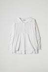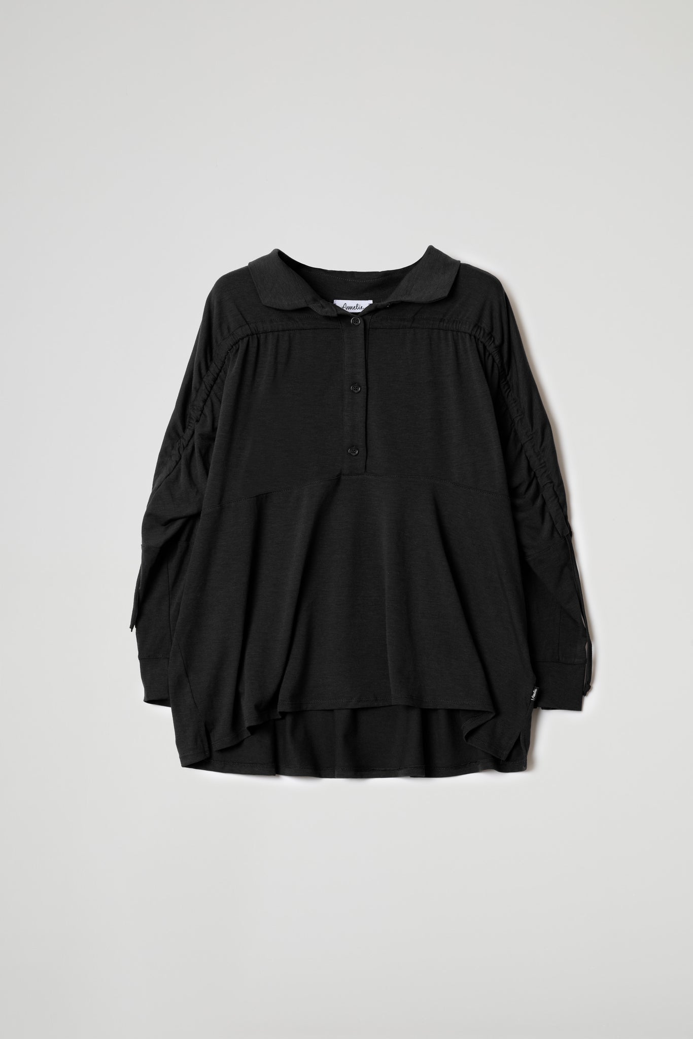 Blusa asimmetrica in morbida viscosa, colletto dal taglio moderno, aperta a metà sul davanti con bottoni, manica lunga con fondo ribattuto alto, dettaglio coulisse regolabile che parte dal collo e scorre lungo la spalla fino alla manica, taglio a carrè con piega sul retro. Linea ampia e morbida