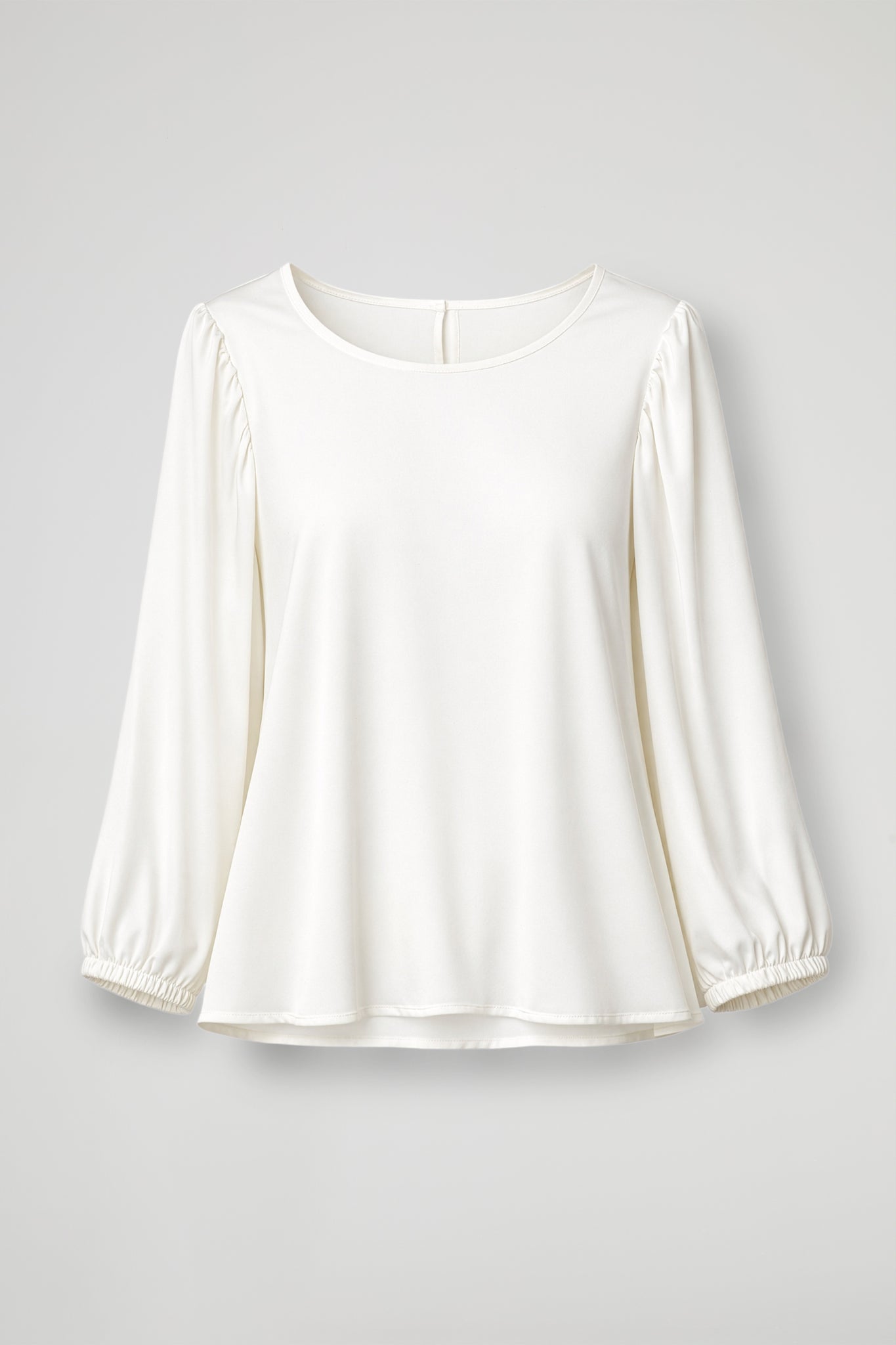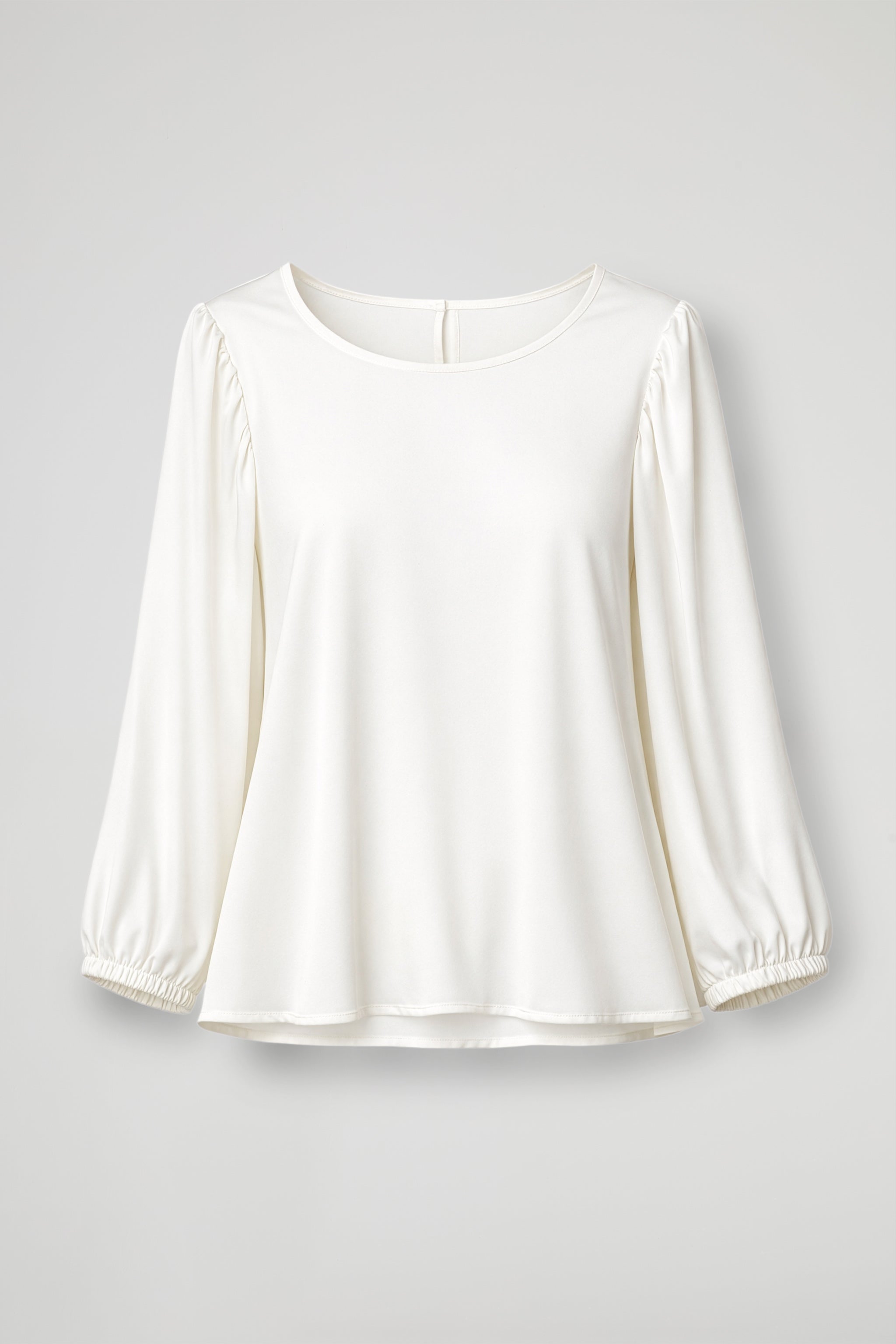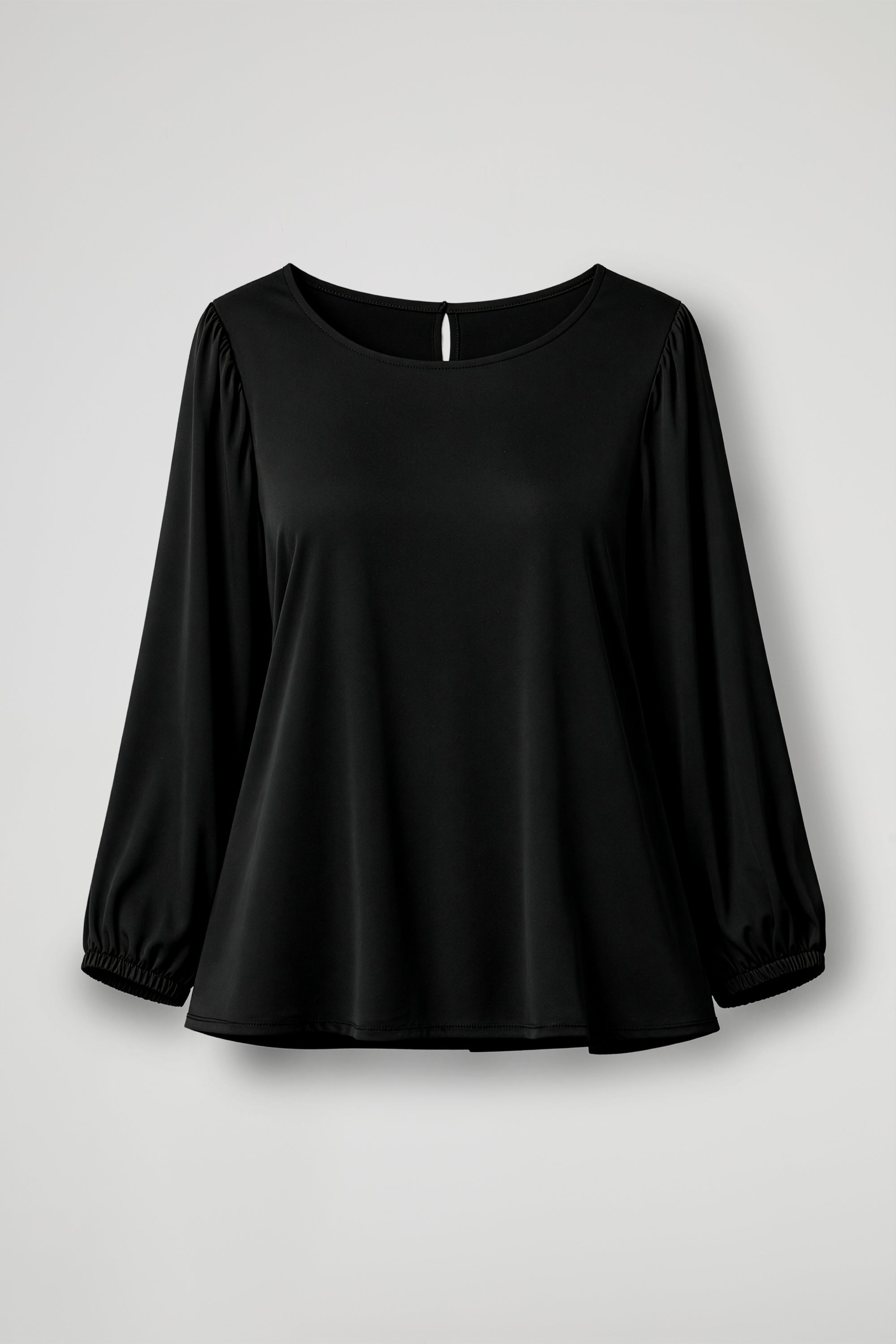 Blusa in raso di viscosa, essenziale e raffinata illumina il look con il suo finish satinato e la caduta morbida. Il girocollo pulito la rende super versatile, mentre le maniche lunghe leggermente a sbuffo con polsino elasticizzato aggiungono un dettaglio femminile e confortevole. La linea leggermente svasata accompagna la silhouette.