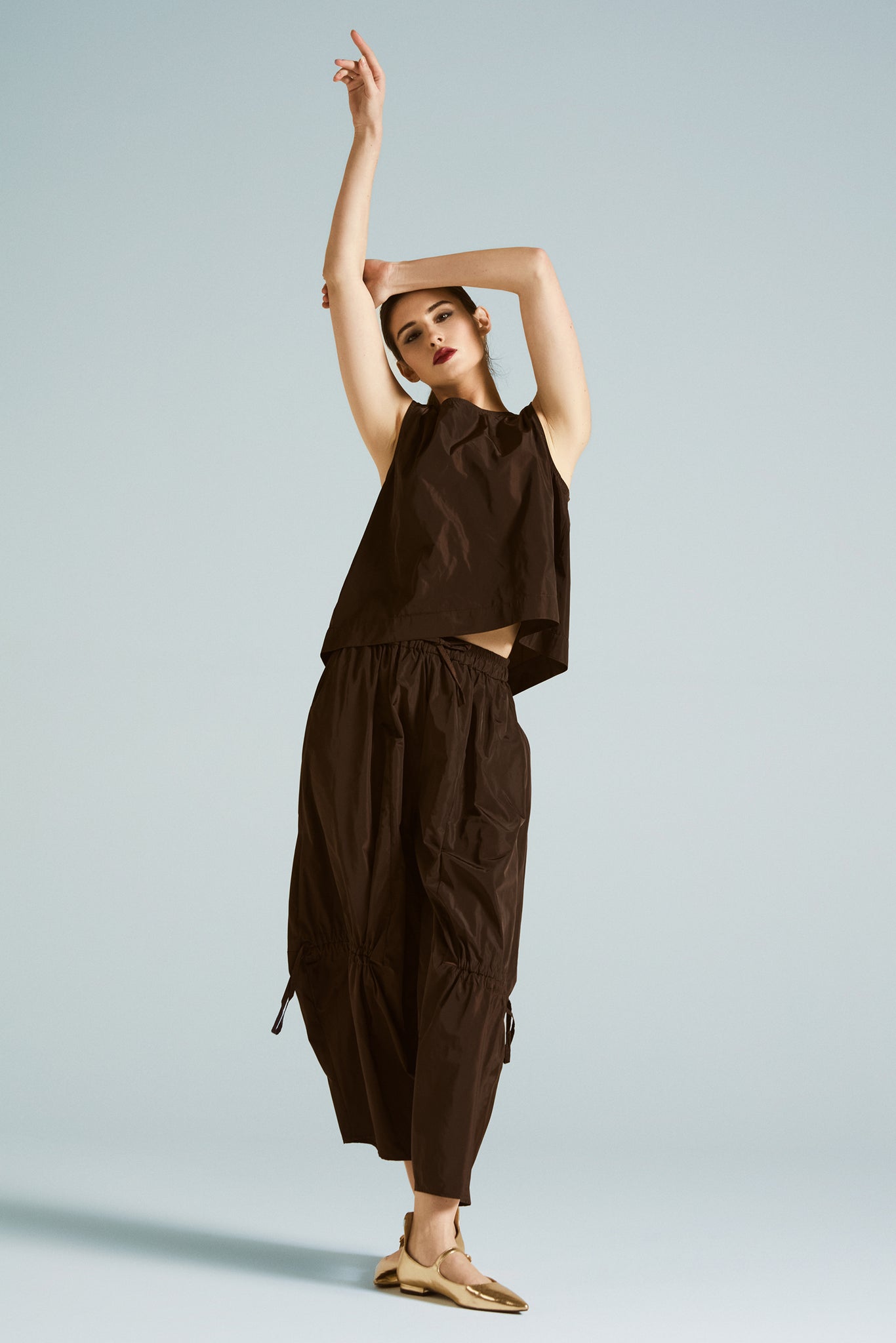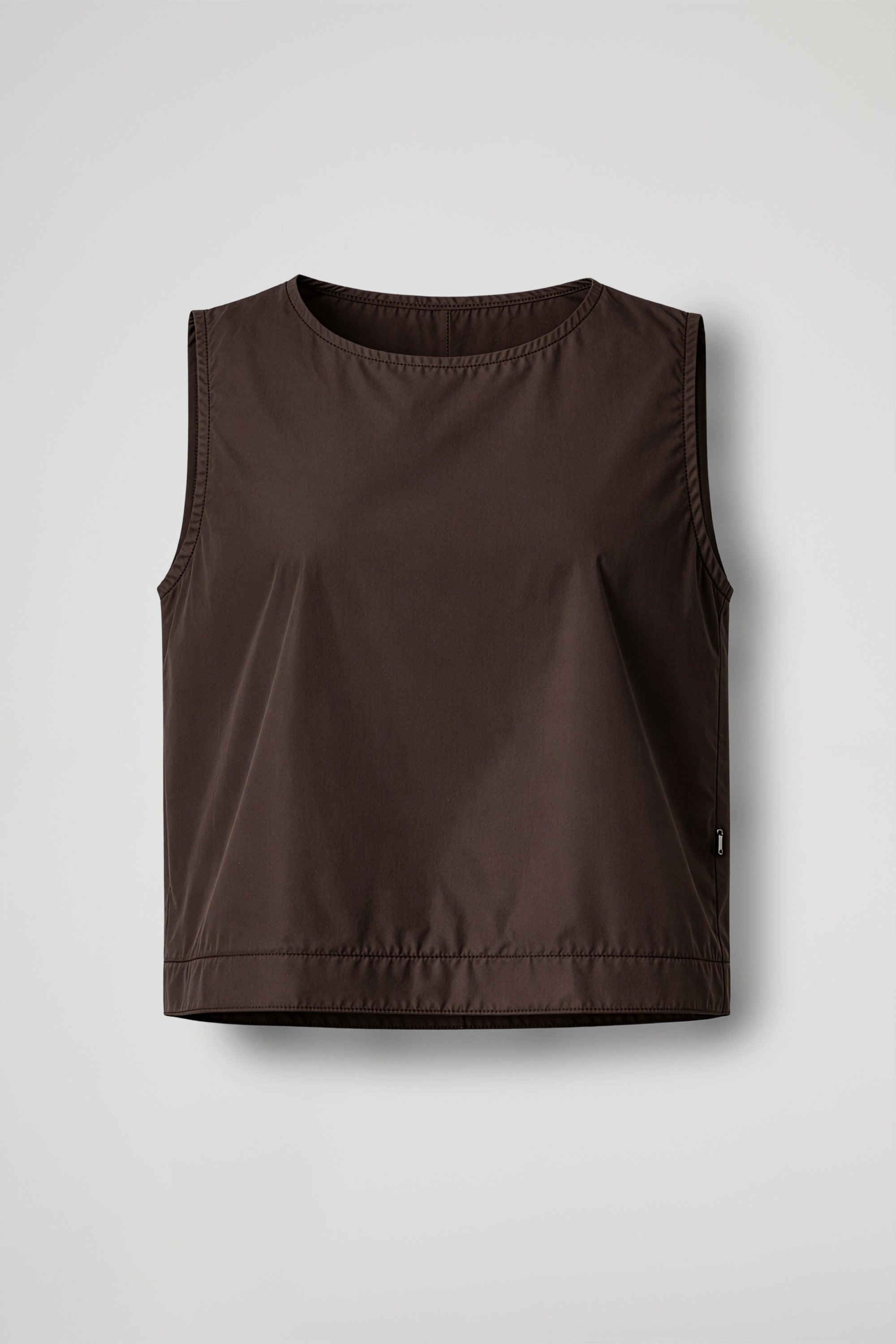 Pulito, moderno e super versatile: questo top smanicato è realizzato in tessuto tecnico effetto nacré, con una finitura leggermente luminosa che illumina il look con discrezione. La linea morbida e minimale lo rende perfetto da indossare ogni giorno, mentre il taglio essenziale lo trasforma in un alleato ideale anche per outfit più chic.